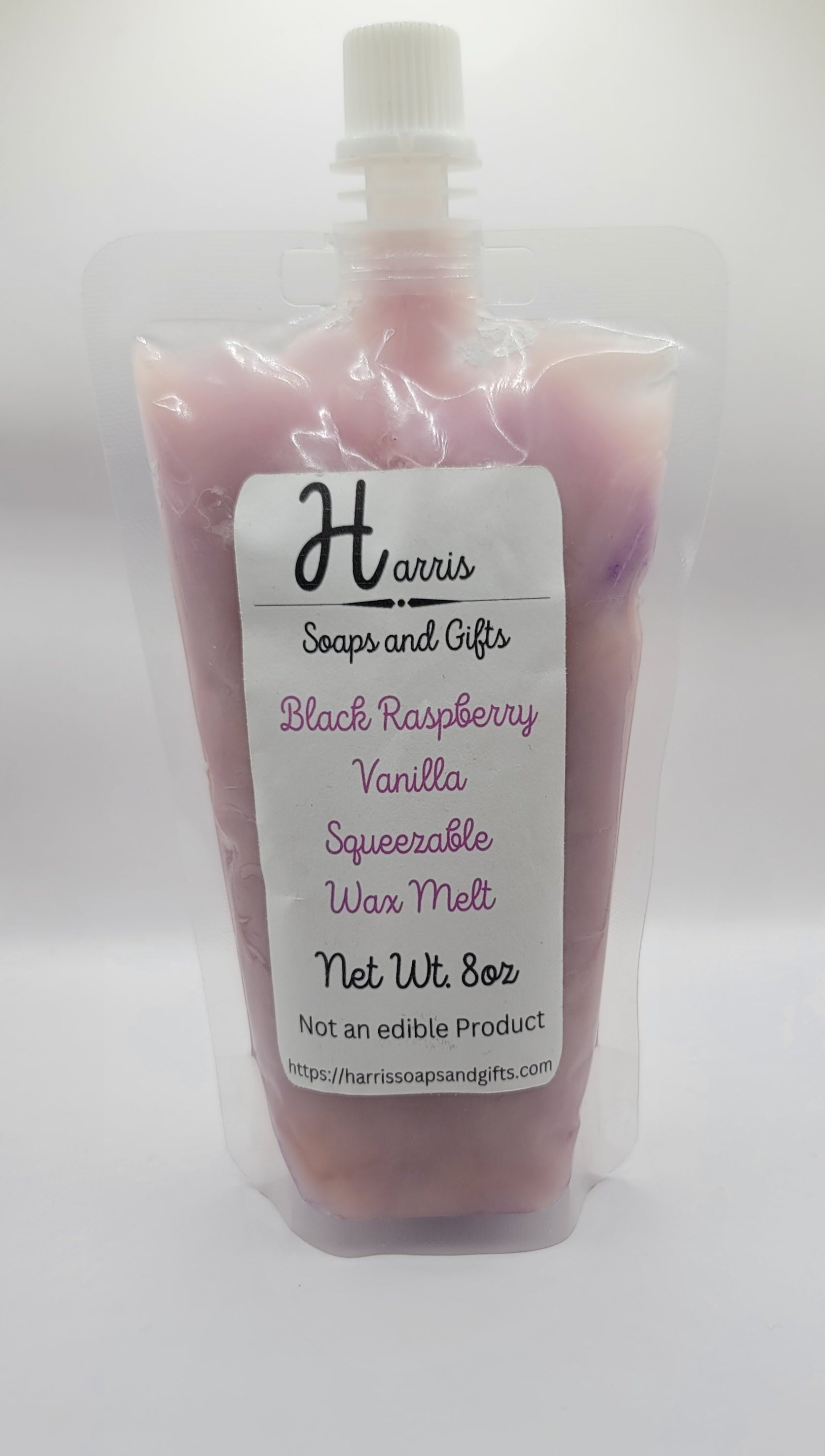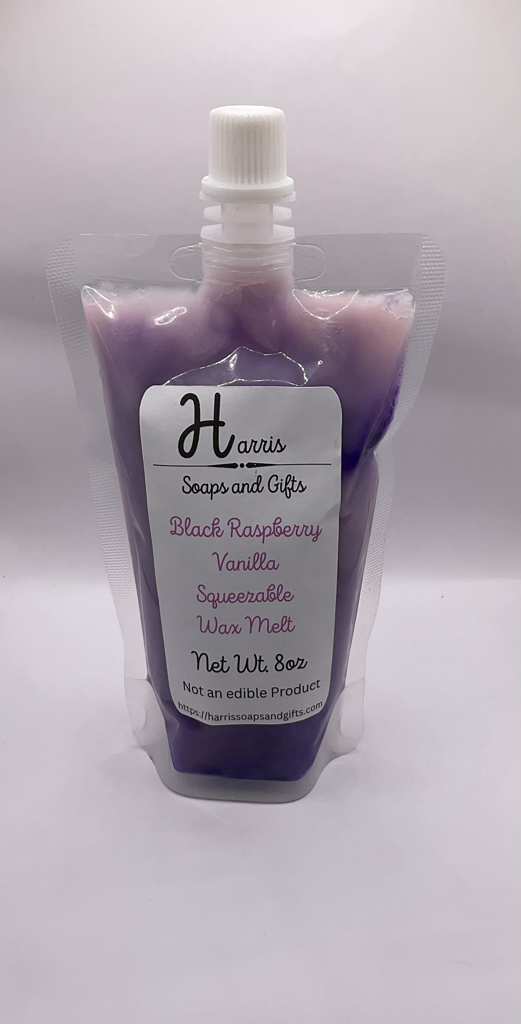8oz Black Raspberry Vanilla Squeezable Wax Melt, Made with 100% Soy wax, Vegetable oil, and Black Raspberry Vanilla oil, and Mica powder for color.