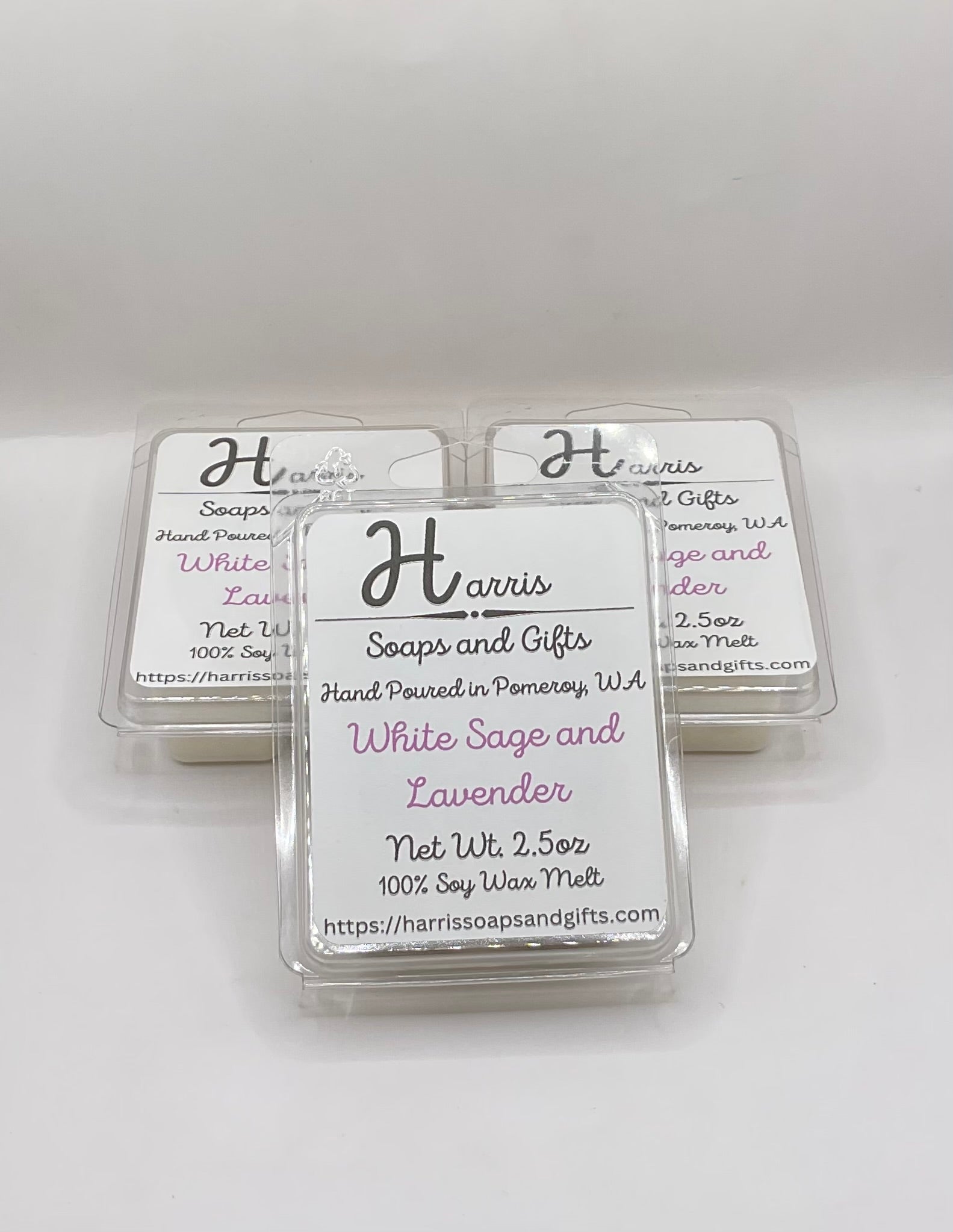 White Sage and Lavender scented, 2.25oz,100% Soy Wax Melt. A clamshell containing 6 cubes of wax for use in approved wax melters, as instructed, to provide your home with your favorite fragrance.