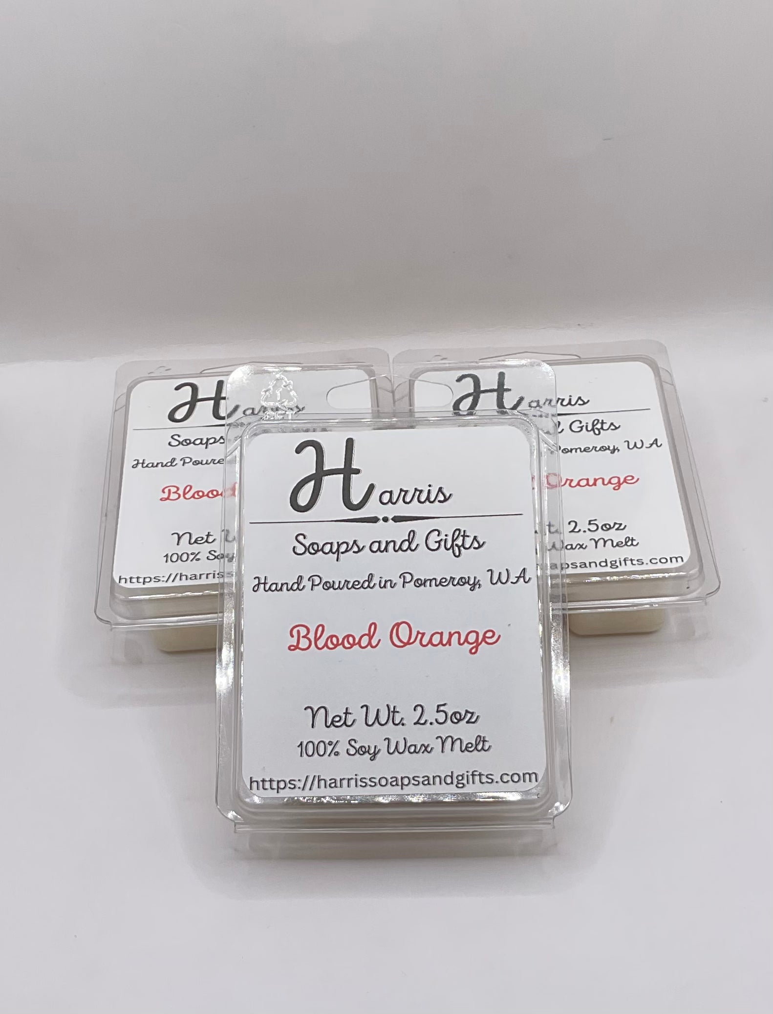 Blood Orange scented, 2.25oz,100% Soy Wax Melt. A clamshell containing 6 cubes of wax for use in approved wax melters, as instructed, to provide your home with your favorite fragrance.